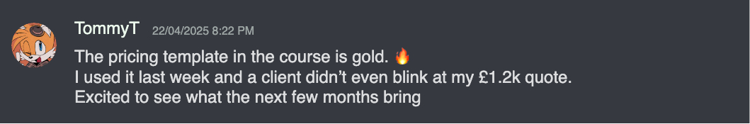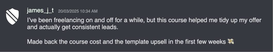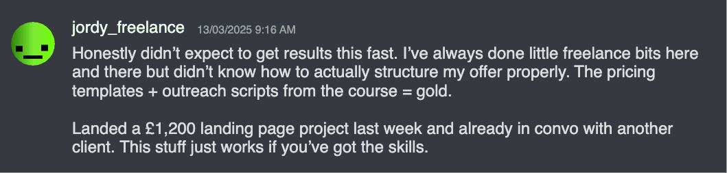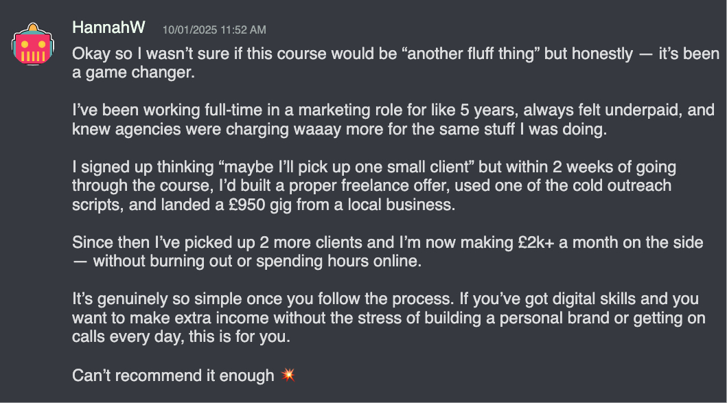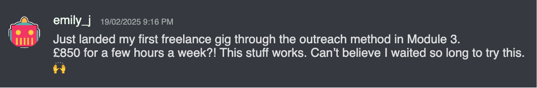 "I wasn’t sure if I had the time for freelancing alongside my job, but this course made it super doable. I followed the steps, sent a few messages, and now I’ve got a small client paying me $850 every month" - Ben J